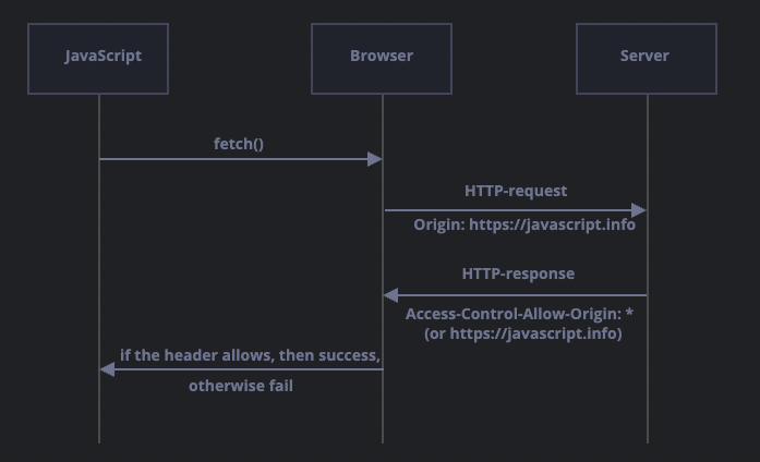 - 브라우저는 서버로부터 받은 응답에 Access-Control-Allow-Origin이 있는지를 확인해서 서버가 크로스 오리진 요청을 허용하는지 아닌지를 확인합니다. 응답 헤더에 Access-Control-Allow-Origin이 있다면 자바스크립트를 사용해 응답에 접근할 수 있고 아니라면 에러가 발생한다