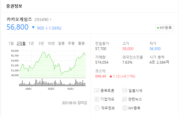 3개월 봉을 보면 49000원 대부터 꾸준하게 상승하는걸 볼 수 있는데 오딘의 영향으로 보인다.