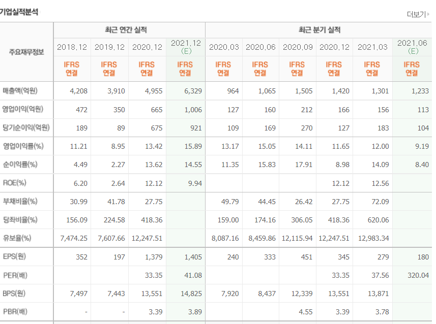 2018년도 부터 2021년까지 꾸준히 순 이익이 발생하고 있으며 2020.12에 당기순이익이 크게 개선되는것으로 보인다.