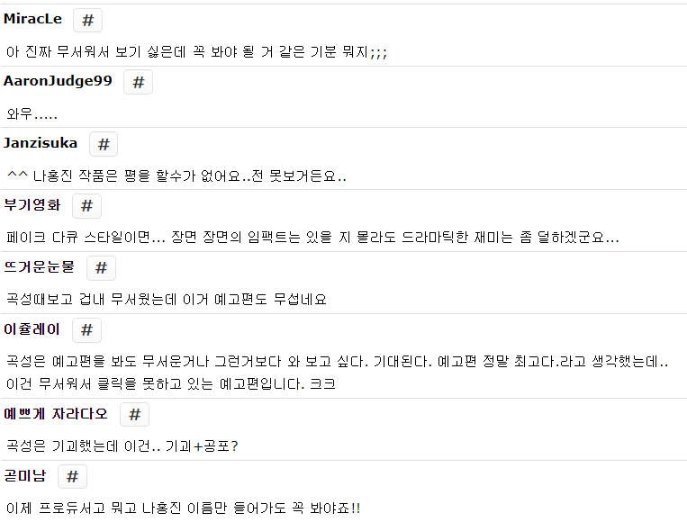 특히 곡성이 아주아주 재미있었는데 《곡성》은 나홍진이 직접 무속인들이랑 한 달 이상 지냈고 절, 일본, 네팔의