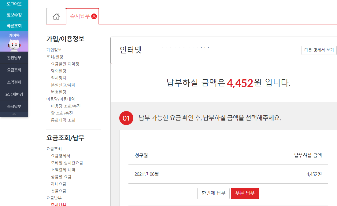 kt에서는 위에 화면처럼 즉시납부 -> 부분 납부 부분에 나눠 낼 수 있는 부분이 있다.