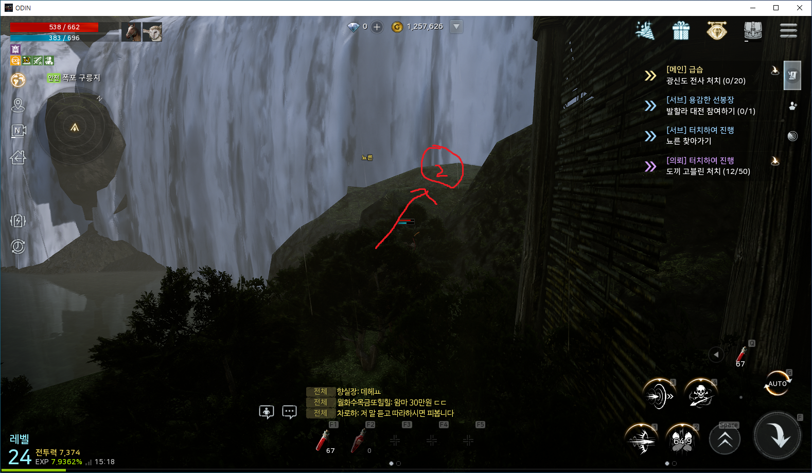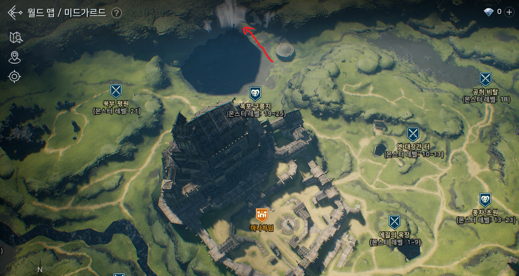 뇨른은 폭포 아래 있다고 나오는데 아래 미니맵에서 빨간 화살표를 따라가면 된다.